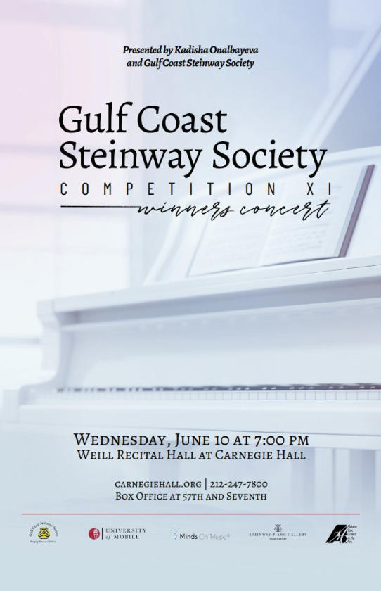 Since 2014, the Gulf Coast Steinway Society, a non-profit organization formed by Steinway Artist Dr. Kadisha Onalbayeva and other music minded individuals from the gulf coast region have promoted fine music through education and performance. The purpose of the Mobile-based society is to promote membership, donations, and fundraisers to further music education of young musicians within the gulf coast region. The GCSS offers the following: • Music Scholarships• Annual Gulf Coast Steinway Music Competition (for residents of the states of Alabama, Florida, Georgia, Mississippi, Louisiana) Winners are invited to perform at the Weill Recital Hall at Carnegie Hall, NYC.• Music programs in public and private schools, colleges, and universities.• Musical events throughout the year at no charge including recitals, concerts, workshops, and master classes.